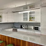 O apartamento tem cozinha totalmente equipada que inclui microondas e máquina de lavar louça.